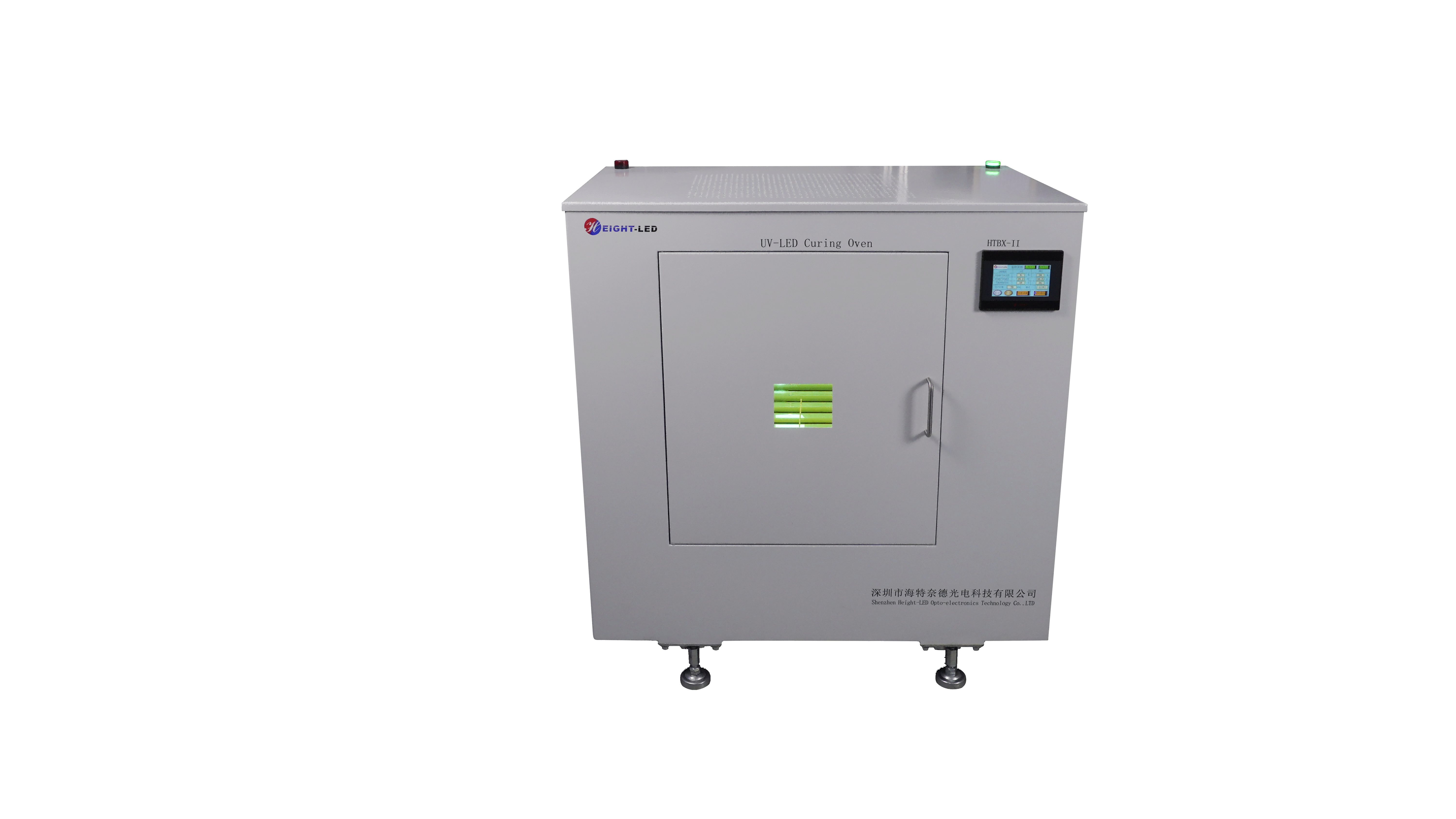 Model HTBX-II-FS400300-300100X2 uvled curing oven for three-side light mode, the top light area of 400mm * 300mm, side light area of 300mm * 100mm * 2, wavelength 365nm.